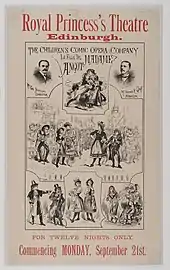 Humbert successfully took the Brussels production to London in May 1873, after which managements there hastened to mount English translations of the piece: three different productions played in London in 1873, three more the following year and five in 1875. Some of Britain's leading theatrical figures were involved: H. J. Byron, H. B. Farnie and Frank Desprez all made adaptations of the text, and London stars including Selina Dolaro, Emily Soldene, Harriet Everard, Fred Sullivan, Richard Temple and Pauline Rita appeared in one or more of the productions.[20] In an 1893 revival at the Criterion Theatre, the cast included Decima Moore, Amy Augarde, Courtice Pounds and Sydney Valentine.[21] By the turn of the century, British revivals had become few, and the last London production recorded by Gänzl and Lamb was at Drury Lane in 1919 during Sir Thomas Beecham's opera season.[20][22]