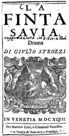 La finta savia is a 1643 drama by Giulio Strozzi written for the Teatro Santi Giovanni e Paolo with music by Filiberto Laurenzi. It is a sequel to Strozzi's La finta pazza (1641) whi was set to music by Francesco Sacrati.[1] The music was mainly by Laurenzi but was supplemented in act 1 with scenes 3 to 5, 10 and 12 by Tarquinio Merula, in scene 6 mainly by Arcangelo Crivelli except for a canzonetta by Laurenzi. In act 1, scenes 2 and 3 were by Crivelli and in act 3 scenes 1 and 7 to 9 by Benedetto Ferrari.[2]