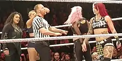 Shortly after WrestleMania 35, Evans was drafted to the Raw brand as part of the 2019 WWE Superstar Shake-up, and placed in her first feud on the main roster as she continuously attacked Raw and SmackDown Women's Champion Becky Lynch.[45][46][47][48][49][50][51] This led to a title match between the two for the Raw Women's Championship on May 19 at Money in the Bank, where Evans lost to Lynch via submission. A few minutes later, Evans helped Flair win the SmackDown Women's Championship from Lynch as she hit her with her finisher, the Women's Right, and allowed her to take advantage of the attack.[52] Throughout mid-2019, Evans continued to feud with Lynch and was defeated by her at Stomping Grounds, she lost again to Lynch, and in the main event, was Baron Corbin's choice for a special referee for the WWE Universal Championship match, due to Seth Rollins dating Lynch.[53] On July 14 at Extreme Rules, Evans and Corbin challenged Lynch and Rollins for their respective titles in a Last Chance Extreme Rules mixed tag team match, where they failed to win the match after Rollins pinned Corbin, thus ending her feud with Lynch.[54]