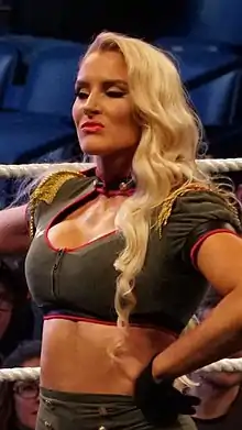 On April 12, 2016, Estrella-Kadlec signed with WWE and was assigned to the developmental brand, NXT, and began training at the WWE Performance Center.[2] At an NXT Live show on October 20, she made her wrestling debut as Macey Estrella in a battle royal, which was ultimately won by Ember Moon.[11] Three months later, in her first appearance on the NXT television program, Evans teamed with Sarah Bridges in a tag team match which they lost to the team of Billie Kay and Peyton Royce.[3][12] In 2017, Estrella was given the ring name Lacey Evans, which is coincidentally, her sister's maiden name.[6] She was used mostly as a jobber to various competitors.[13][14][15] In July, Evans participated in the inaugural Mae Young Classic,[16] defeating Taynara Conti in the first round,[17] but losing to Toni Storm in the second round.[18]