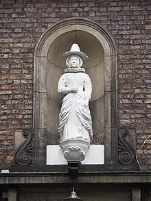 In 1827, the hospital was demolished, and rebuilt further back from the street, as a two-storey brick structure. It was designed by Peter Atkinson, and was completed in 1829. The garden walls also date from this period. In the centre of the front is a statue of a woman in Puritan dress, which is believed to survive from the original building.[2][3]