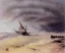 According to legend, the first mate, John Rivers, a rival for the hand of the captain's young wife, was pacing the decks in jealous anger. While the captain, his wife and their guests were celebrating the marriage below deck, the first mate was seized with a fit of jealous rage. Casually drawing a heavy, club-like belaying pin from the rail, the mate walked softly up behind the crew member at the wheel and felled him to the deck with one crushing blow. Rivers then seized the wheel and steered the ship onto the treacherous Goodwin Sands, killing everyone aboard.[6] A subsequent inquiry into the disaster recorded a verdict of misadventure.[2]