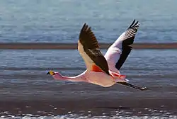 Set in the backdrop of snow-covered mountains, the lake, like its neighbours, is famous for a variety of high Andean waterfowl, particularly flamingos (mostly white for the reason that algae that creates the pink colour is comparatively less in the lake waters[7]), and other bird species such as ducks and the Andean goose, and herds of vicuña are also reported. The southern lakes in the Bolivian Altiplano including Laguna Hedionda form one of the major wintering grounds for Phalaropus tricolor followed by Phoenicopterus chilensis and Phoenicopterus jamesi. On one particular date in February 1979, Phalaropus tricolor, Phoenicoparrus jamesi, Phoenicoparrus andinus and Phoenicopterus chilensis counted in the area were about one million, out of which 500,000 were reported from Laguna Hedionda and two other lakes.[1][2][5]