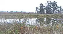 The Laguna de Santa Rosa provides recreation and agricultural and industrial water supply plus wildlife habitat including cold freshwater habitat.[10] The Laguna is a complex of habitat types including freshwater riparian forest and floodplains, seasonal wetlands and vernal pools, upland valley oak savanna and freshwater tule marsh. A number of rare and endangered species are found in the Laguna, such as the California tiger salamander (Ambystoma californiense), California freshwater shrimp (Syncaris pacifica) and Sebastopol meadowfoam (Limnanthes vinculans). As an element of the Pacific Flyway, the Laguna is home to a large variety of avifauna including Ridgway's rail, Canada goose (Branta canadensis), turkey vulture (Cathartes aura), black-necked stilt (Himantopus mexicanus), burrowing owl (Athene cunicularia), great egret (Casmerodius albus), great blue heron (Ardea herodias) and American kestrel (Falco sparverius). More than 200 species of birds are known to reside in or feed and rest in the Laguna in the course of migration. Salmonid species listed as threatened or endangered species are known to travel through the Laguna to spawn in its tributaries, including steelhead trout (Oncorhynchus mykiss) and coho salmon (Oncorhynchus kisutch).