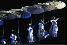 The final scene of the play, showing the seven nymphs climbing on the seven steps, each having a white umbrella held over their heads, signifying that peace leaves an indestructible and unforgettable impression