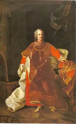 Initially known as a captain, Batthyány fought in 1716 at the Battle of Peterwardein and at the Siege of Temesvár under the command of Prince Eugene. He then switched to the civil service.[1] In 1737 he became the Hungarian Court Chancellor in Vienna. As such, he took part in the Diet in Pressburg in 1741 and supported Empress Maria Theresa in a memorable speech.[1] He was Chief Cupbearer (Obermundschenk), privy councilor and from 1744 a Knight of the Golden Fleece (No 712). In 1751 he became the last Palatine of Hungary until his death. In 1756 he raised a regiment of hussars that fought in the Seven Years' War.[1] He chose Bicske Castle as his administrative and head office and extensively remodeled it.[1]