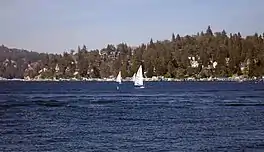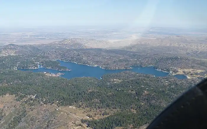 Lake Arrowhead is an artificial lake located in the San Bernardino Mountains on Little Bear Creek, a tributary of Deep Creek and the Mojave River. It has a surface area of approximately 780 acres (320 ha) and a capacity of 48,000 acre⋅ft (59,000 dam3).[1] It is surrounded by the unincorporated community of Lake Arrowhead in San Bernardino County, California.
