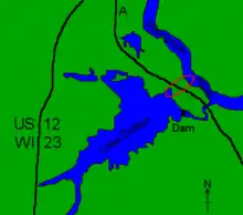 On the morning of June 9, 2008, a 400-foot (120 m) portion of County Trunk Highway A that traverses the north side of Lake Delton failed, creating a new drainage channel to the Wisconsin River. At 2 a.m. that day, 12 inches (300 mm) of rain caused one hundred residents to start sandbagging.[13][16] The lake waters overflowed County Highway A about a quarter mile from the dam, and most of the lake emptied in two hours.[4] The water began overflowing at approximately 10 a.m.[4] As the water overtopped the isthmus, it flowed downhill to the Wisconsin River approximately 800 feet (240 m) away, quickly eroding and creating a 400-foot-wide (120 m) channel that rapidly drained the lake in an out-of-control torrent into the river, 40 feet (12 m) below the lake's level.[4] Three homes washed away, and another two were destroyed when their foundations were undermined by the new outflow.[13] The sediments at the bottom of the lake were visible.[13] "We have nothing but mud in front of us now," said Tom Diehl, operator of the Tommy Bartlett Show and a Lake Delton village trustee. "No water. Just mud."[4]