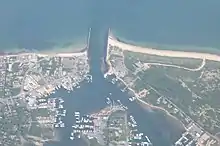 The lake was originally referred to on maps as Lake Wyandanch and commonly referred to as the "Great Lake". It was the largest body of freshwater on Long Island, more than double the size of Lake Ronkonkoma. In 1927, real estate developer Carl Fisher blasted a gap on the northern shoreline to connect the lake to Block Island Sound and the Atlantic Ocean.[1][2]