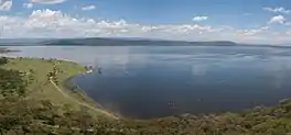 The lake had a normal surface area of 139 square kilometres (54 sq mi)[3] before 2010 and had increased to 198 square kilometres (76 sq mi) by 2020.[4] It is surrounded by a swamp which covers an area of 64 square kilometres (25 sq mi), but this can vary largely depending on rainfall. It is situated at an altitude of 1,884 metres (6,181 ft).[3] The lake has an average depth of 6 metres (20 ft), with the deepest area being at Crescent Island, at a maximum depth of 30 metres (98 ft).[3] Njorowa Gorge once formed the lake's outlet, but it is now high above the lake and forms the entrance to Hell's Gate National Park. The town of Naivasha (formerly East Nakuru) lies on the north-east edge of the lake.