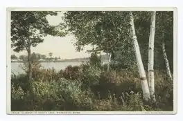 Onota Lake is located in Pittsfield, Massachusetts. It is 617 acres (2.50 km2) in area, located entirely in the City of Pittsfield and is owned by it. It is divided into north and south basins due to the old roadway that marked to north end with minimal water exchange between them and empties via Onota Brook which flows southeast into the West Branch of the Housatonic River in Pittsfield. The "cottagers" of the late 19th century and early 20th century built large summer mansions along its shores.