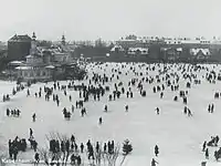 The Lake Pavilion was built for the Copenhagen Ice Skating Club, whose members had used The Lakes for ice skating during the winter months since the club's foundation in 1870. They first used Sortedam Lake but from 1886 also Peblinge Lake.[2]