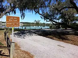 There is a county park with a swimming area and boat ramp on the lake's southeastern shore.[2][3] The boating public may reach Lake Roy from other lakes by traveling to it via the canal system. Fishing is allowed and the lake may be fished from Lake Roy Park or from the north shore where Cypress Gardens Boulevard borders the lake. The Hook and Bullet website says Lake Roy contains bowfin, bluegill and sturgeon.[4]