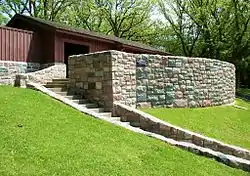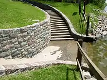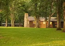 In 1992 two districts of surviving WPA structures in Lake Shetek State Park were placed on the National Register of Historic Places.[4] A 34-acre (14 ha) district on the lakeshore comprises six contributing properties: the 1938 causeway to Loon Island, 1939 beachhouse, and (all built in 1940) the beachhouse steps, kitchen shelter, sanitation building, and drinking fountains.[17] Two buildings at the Zuya Group Center were listed in a 2.5-acre (1.0 ha) district: the 1940 mess hall and 1941 crafts & recreation building.[18] The hillside beachhouse and 6-foot-wide (1.8 m) curving double staircase are particularly noteworthy. Historian David R. Benson has called it "one of the most attractive designs in the park system."[15]