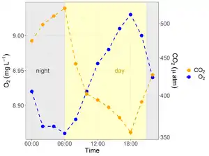 Example of O2 and CO2 cycle within a lake upper mixed layer (epilimnion). During the day, gross primary production outpaces lake respiration resulting in a net production of O2 and consumption of CO2. Later in the day when solar radiation is reduced and during the night when there is no light, respiration still occurs in the absence of gross primary production resulting in net consumption of O2 and production of CO2. Data for this figure are from Harp Lake on August 1, 2014.[5]