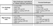 Catchment properties, namely land cover, land use, and geologic characteristics, influence lake metabolism through their impact on the quality of organic matter and nutrients entering the lake as well as wind exposure. The organic matter quality can impact light attenuation, and along with wind exposure, can influence heat and light distribution throughout the water lake column. Lakes in landscapes dominated by agriculture have higher nutrient inputs and lower organic matter inputs compared to lakes with similar drainage ratio but in landscapes dominated by forests. Thus, lakes in agricultural-dominated landscapes are expected to have higher primary production rates, more algal blooms, and excessive macrophyte biomass compared to lakes in forest-dominated landscapes (Figure). However, the effects of catchment size and catchment type are complex and interactive. Relatively small forested lakes are more shaded and protected from wind exposure and also receive high amounts of allochthonous organic matter. Thus, small forested lakes are generally more humic with a shallow mixed layer and reduced light penetration. The high inputs of allochthonous organic matter (produced outside the lake) stimulate heterotrophic communities, such as bacteria, zooplankton, and fish, enhancing whole-lake respiration rates. Hence small forested lakes are more likely to be net heterotrophic, with ER rates exceeding primary production rates in the lake. On the other hand, forested lakes with low drainage ratio receive relatively less nutrients and organic matter, typically resulting in clear-water lakes, with low GPP and ER rates (Table).