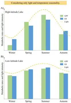 Light is a primary driver of lake metabolism, thus seasonality in light levels is an important driver of seasonal changes in lake metabolic rates. Therefore, it is expected GPP rates to be more pronounced during seasons such as spring and summer, in which light levels are higher and days are longer. This is especially pronounced for lakes with light-limited GPP, for example, more turbid or stained lakes. Seasonality in light levels also affects ER rates. Ecosystem respiration rates are usually coupled with GPP rates, thus seasons with higher GPP will also show higher ER rates associated with increased organic matter produced within the lake. Moreover, during seasons with higher light levels photodegradation of organic matter is more pronounced, which stimulates microbial degradation, enhancing heterotrophic respiration rates.