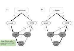 The amount of material available for assimilating into organismal cells controls the rate of metabolism at the cellular to lake ecosystem level. In lakes, phosphorus and nitrogen are the most common limiting nutrients of primary production and ecosystem respiration. Foundational work on the positive relationship between phosphorus concentration and lake eutrophication resulted in legislation that limited the amount of phosphorus in laundry detergents, among other regulations.[21][22] Although phosphorus is often used as a predictor of lake ecosystem productivity and excess phosphorus as an indicator of eutrophication, many studies show that metabolism is co-limited by phosphorus and nitrogen or nitrogen alone.[23] The balance between phosphorus, nitrogen, and other nutrients, termed ecological stoichiometry, can dictate rates of organismal growth and whole-lake metabolism through cellular requirements of these essential nutrients mediated by life-history traits. For example, fast-growing cladocerans have a much lower nitrogen to phosphorus ratio (N:P) than copepods, mostly due to the high amount of phosphorus-rich RNA in their cells used for rapid growth. Cladocerans residing in lakes with high N:P ratios relative to cladoceran body stoichiometry will be limited in growth and metabolism, having effects on whole-lake metabolism. Furthermore, cascading effects from food web manipulations can cause changes in productivity from changes to nutrient stoichiometry. For example, piscivore addition can reduce predation pressure on fast-growing, low N:P cladocerans which increase in population rapidly, retain phosphorus in their cells, and can cause a lake to become phosphorus limited, consequently reducing whole-lake primary productivity.