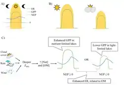 Day-to-day differences in incoming light and temperature, due to differences in the weather, such as cloud cover and storms, affect rates of primary production and, to a lesser extent, respiration.[51] These weather variations also cause short-term variability in mixed layer depth, which in turn affects nutrients, organic matter, and light availability, as well as vertical and horizontal gas exchanges. Deep mixing reduces light availability but also increases nutrients and organic matter availability in the upper layers. Thus the effects of short-term variability in mixed layer depth on gross primary production (GPP) will depend on which are the limiting factors on each lake at a given period. Thus a deeper mixing layer could either increase or decrease GPP rates depending on the balance between nutrient and light limitation of photosynthesis (Figure).