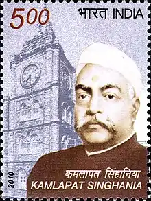 Kamlapat founded the Merchants' Chamber of Uttar Pradesh in 1932.[20] Kamla Nagar in Kanpur — a township for JK employees – is named after Kamlapat Singhania. A number of institutions founded by members of Singhania family bears his name. Some of them are LK Singhania Education Centre at Gotan, JK Lakshmipat University, JK Institute of Radiology and Cancer Research at Kanpur, Lala Kamlapat Memorial Hospital at Kanpur, J.K. Institute of Applied Physics and Technology (University of Allahabad) and JK Institute of Sociology and Human Relations (University of Lucknow).[21][22][23] A commemorative stamp was issued in 2010 by the Indian government honoring Lala Kamlapat Singhania.[24][25]