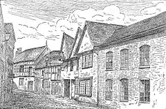 The original building was lost in the fire of 1583, which destroyed much of the centre of the town, including the town end of Hospital Street.[5] The Lamb is not among the seven named "Innes for lodging" recorded as having been burned,[6] as the building at that date was being used as a house by James Bullen. Bullen had become the tenant in 1569; he was a cutler and kept a shop next door. The house cost £58 6s 8d to rebuild, of which £18 6s 8d came from the town rebuilding fund. It was not completed before Bullen's death in 1585, the final installment from the fund being paid to his son, Thomas.[3][5][7]