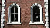 At the west (left) side, a narrow four-storey wing is attached.[1] In the original Bower design, this section was capped with a high concave roof to form a tower; this was demolished in 1937 and the wing is now completed with a brick parapet.[13][14] The windows in this bay all have brick surrounds; the two first-floor windows and single second-floor window have arched tops, while the third-storey window has a horizontal top. It has a covered passageway with a horizontal stone top leading to a yard, which was preserved in the redevelopment.[1] The original passage entrance had an arched top, matching the windows; this was altered some time after 1914.[13] The stone bands from the main section continue, and are repeated between the second and third storeys.