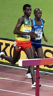 Lamecha Girma (born 26 November 2000)[2] is an Ethiopian athlete who specialises in the 3,000 metres steeplechase. He is the 2020 Tokyo Olympic silver medallist in the event and won silver medals at the 2019, 2022 and 2023 World Athletics Championships. Lamecha also won a silver in the 3,000 metres at the 2022 World Indoor Championships. He is the world indoor record holder for the 3,000 metres, which was set in February 2023. In June 2023 at the Meeting de Paris of the Diamond League, he broke the world record for the men's 3,000 metres steeplechase.