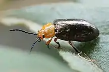 Adults of this genus are 6-14 mm long (15 mm has also been reported[3]) with relatively narrow and flat bodies.[4] The elytra may be dark blue or dark green, while the head and pronotum may be red, orange or yellow.[5][6] The prosternum is either anteriorly produced at middle, or the pronotal hypomeron has a groove parallel to pronotal margin. The middle of each side of the pronotum usually has large irregular punctate depressions. An elytral posthumeral depression is usually present. As in other leaf beetle genera, the two sexes can be distinguished by the shape of the last abdominal ventrite: it has a rounded apex in females and a truncate apex in males.[4]