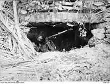 The ships arrived off Scarlet beach on time, and the destroyers conducted a short 11-minute preliminary bombardment.[40][42] It was doubtful if any Japanese positions were hit or any casualties inflicted.[43] Low cloud trapped the smoke and dust produced by the bombardment.[40] To the Australians, it was "dark as the inside of a cow".[44] Scarlet Beach and Siki Cove were covered by bunker-type pillboxes made of logs, spaced about 50 yards (46 m) apart, and connected by shallow trenches. They held about 300 Japanese defenders.[45] Japanese tracer fire started pouring from the shore. At this point, one Australian recalled "I realised that this was not an unopposed landing."[46] It was the first opposed landing by Australian troops since the Landing at Anzac Cove in the Gallipoli Campaign of 1915.[46]