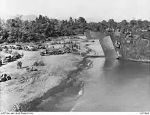 The sixth and final wave consisted of LST-18, LST-168, and LST-204.[38] They had instructions to wait until the smaller craft had cleared the beach, and beached at 06:50.[61] Each carried an unloading party of 100 men, drawn from the 2/23rd and 2/48th Infantry Battalions, and 2/2nd Machine Gun Battalion, who would return with the LSTs.[60] The unloading proceeded at a rapid pace. All the cargo was unloaded from two of the three when they retracted at 09:30, and headed off escorted by ten destroyers and the fleet tug USS Sonoma.[61] The 2/3rd Field Company, 2/1st Mechanical Equipment Company, 2/3rd Pioneer Battalion, and the Shore Battalion of the 532nd Engineer Boat and Shore Regiment prepared four beach exits. Stores were quickly moved off the beach to inland dumps.[62][63][58] Some 5,300 troops, 180 vehicles, 32 25-pounders and Bofors 40 mm guns, and 850 measurement tons (960 m3) of bulk stores had been unloaded.[64]
