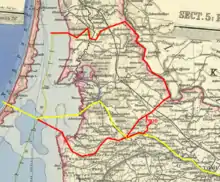 The seat was in Heydekrug (modern Šilutė). In 1913, Karkeln and surrounding inland towns (those south of the yellow line in the map) were administratively transferred to Kreis Niederung.[1] After World War I, Landkreis Heydekrug and other areas north of the yellow line became part of Memel Territory administered by Lithuania.
