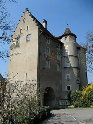 As a counterpart to Stein Castle, the count's administrative seat, the Niderhus was built on the opposite side of the river in the 12th century, first mentioned in 1265 as "Lower Fortress" (Niderhus).[2] Initially, servants of the Counts of Lenzburg lived there. The building came into the possession of the Counts of Kyburg through inheritance in 1173. In 1264, the Habsburgs took over the management of the building, and nine years later they owned it entirely. When the city fortifications were expanded around 1360, the Niderhus was included as a bridgehead in the fortifications. Access to the bridge was through an archway, a wall led from the building to the Lägernkopf and thus completely sealed off the passage on the right bank of the Limmat.[3][4]