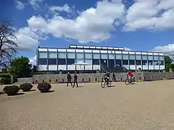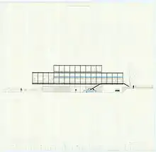 The design of the current Langelinie Pavilion shows inspiration from Mies van der Rohe and American Modernism. The building is composed of three box-like volumes. The low ground floor is built in reinforced concrete and appears closed with its narrow, highly placed horizontal windows. The "floating" main floor is significantly larger and higher than the ground floor. It measures approximately 30 by 30 metres and has a curtain wall in glass with thin, exterior steel pillars. The upper floor is again smaller and lower than the main floor. It opens to a narrow balcony to the east.[5]