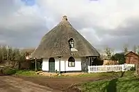 To the east of the church is The Round House, a Grade II listed cottage ornée built of whitewashed mud and stud, and thatched, dating from the early 19th century,[9] English Heritage defines cottage ornee as "a rustic building of picturesque design".[10]
