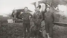 Lansing C. Holden, Jr. (Denny) with mechanics. April–May 1918. Le Bourget, France. Escadrille 471.