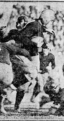 Marks with the ball being tackled by William H. Abbott and Joe Pondelik of the Chicago Maroons in the November 10, 1923 Indiana Hoosiers game versus them