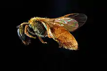 L. vierecki can be distinguished by its extremely hairy, orange-yellow abdomen with clear golden yellow hair on its scutellum, and pits touching the scutellum.[4] There are several other differences from bees that have similar colored abdomen. Its antennae is darker on the bottom half, and the rugae reaches the top of the metathorax, which has narrowly-spaced punctures. Though the abdomen has punctures as well, it does not have a bronze-colored reflection and is not smooth and shiny. The mesonotum, which is the same color as the abdomen, is not smooth and polished in the middle and has small punctures. The first abdominal segment differs from other segments due to its bluer color and punctures. The legs are lighter but not polished.[11]