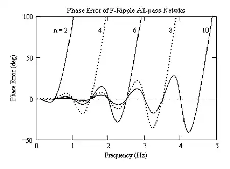 The phase error plots (i.e. the deviation of the phase response from linear) for even order networks from n = 2 to 12 are given in the accompanying figure.