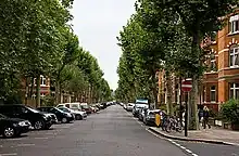 The street was built in 1875 and was named after a prominent Paddington resident the Earl of Lauderdale, an admiral in the Royal Navy.[1] Built some time after the streets to the south of it were laid out, it was not until the late nineteenth century and the Edwardian era that the area was completed. It features large red brick mansion blocks with apartments, in contrast to the area further south which featured the white stucco terracing of the early-to-mid Victorian era.[2] Typical of the style of the street, and surrounding area, is Lauderdale Mansions South. In 1896 the Lauderdale Road Synagogue was built in the street to serve the significant Jewish population in the area.[3] It was constructed in the Neo-Byzantine style and is now Grade II listed.[4][5]