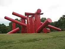 One of the park's best-known works, The Way, was completed by Alexander Liberman in 1980. Constructed from eighteen salvaged steel oil tanks,[24] the sculpture is 65 feet (20 m) tall, 102 feet (31 m) wide, and 100 feet (30 m) deep,[25] and weighs 55 short tons (50 t).[26] It is painted cadmium red.[24] The park website describes the sculpture as a modernist work, "meant to represent the awe-inspiring impact of classical Greek temples and mammoth Gothic-style cathedrals" and modeled on post and lintel architecture.[24]