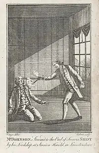 The Ferrers' estates were then vested in trustees; Ferrers secured the appointment of an old family steward named Johnson, as receiver of rents. This man faithfully performed his duty as a servant to the trustees, and did not prove amenable to Ferrers' personal wishes. On 18 January 1760, Johnson called at the earl's mansion at Staunton Harold, Leicestershire, by appointment, and was directed to his lordship's study. Here, after some business conversation, Lord Ferrers shot him.[3] Johnson did not die immediately, but instead was given some treatment at the hall followed by continued verbal abuse from a drunken Ferrers before a physician, Thomas Kirkland, was able to convey him to his own home where he died the following morning.[5]