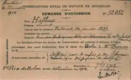 Student card of L. Halleux at the Royal Conservatory of Brussels