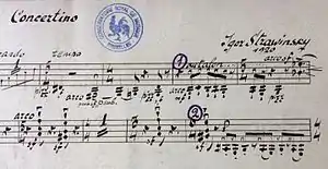 Detail of I. Stravinsky's Concertino pour string quartet (op. 20) autograph manuscript (Library of the Royal Conservatory of Brussels, B-Bc, CR)
