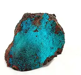 At the type locality, lavendulan occurs associated with erythrite and a cobalt molybdate originally called pateraite, but now discredited.[6] At San Juan, Chile, it is associated with erythrite, cuprite, malachite and cobaltian wad.[5] At the Cap Garonne Mine, Pradet, Var, Provence-Alpes-Côte d'Azur, France, associated minerals are chalcophyllite, cyanotrichite, parnauite, mansfieldite, olivenite, tennantite, covellite, chalcanthite, antlerite, brochantite and geminite.[5] It also occurs at Tsumeb, Namibia, associated with cuprian adamite, conichalcite, o'danielite, tsumcorite, fahleite, quartz, calcite and gypsum.[5]