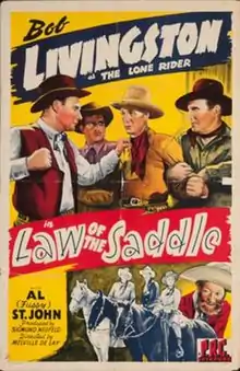 Law of the Saddle is a 1943 American Western film directed by Melville De Lay and written by Fred Myton. The film stars Robert Livingston as the Lone Rider and Al St. John as his sidekick "Fuzzy Jones", with Betty Miles, Lane Chandler, John Elliott and Reed Howes. The film was released on July 20, 1943, by Producers Releasing Corporation.[1][2][3]