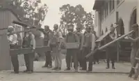 Berkeley School of Mining students at the entrance to Lawson Adit in 1918 during a mine rescue drill. One of the men is carrying a box from the Hercules Powder Company.