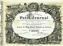 Share of the SA du Petit Journal, issued 1 April 1896 with the 5 centimes coin at the bottom