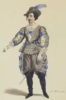 Although he was a prolific novelist and playwright, Alexandre Dumas rarely ventured into writing for the opera stage. Le roman d'Elvire was his fourth and last such work.[lower-alpha 1] His collaborator was Adolphe de Leuven who had co-written the librettos of four earlier operas composed by Thomas, all of them in the opéra comique genre. The Théâtre Impérial de l'Opéra-Comique premiered Le roman d'Elvire on 4 February 1860 with Achille-Félix Montaubry and Mademoiselle Monrose in the lead roles of Gennaro and Elvire. The production was directed by Toussaint-Eugène-Ernest Mocker. The opera ran for 33 performances, but its mixed reviews and lukewarm reception led Thomas to abandon opera composition for the next six years. He would return in 1866 with Mignon which proved to be a great success both in France and abroad.[3][4][1][5][6]