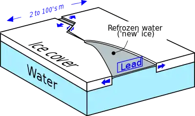 A lead (/ˈliːd/, rhymes with "reed") is a large fracture within an expanse of sea ice, defining a linear area of open water that can be used for navigation purposes.[1][2][3] Leads vary in width from meters to hundreds of meters.[4] As is the case for polynyas (another sea ice feature involving open water), leads allow the direct interaction between the atmosphere and the ocean, and are important for Arctic sea ice ecology. Additionally it has been lately found that ice leads contribute significantly to the amount of mercury deposited onto surface and leaked into the ocean.[5] If the air is cold enough (typically in the winter), the water within a lead quickly refreezes, such that in many cases, leads are partly or entirely covered by a thin layer of new ice.[6]
