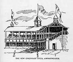 After a season and a half of playing in the charred ballpark, the Reds built what they expected to be a more permanent new grandstand, again in the southwest corner, retaining the original seating, and again with a gap between the seating areas that would prove fortuitous. The original seating had changed somewhat over time, as the middle section no longer sat higher than the rest (it had been rebuilt in 1894 to be leveled with the rest of the grandstand), and the entire structure was roofed.[3]